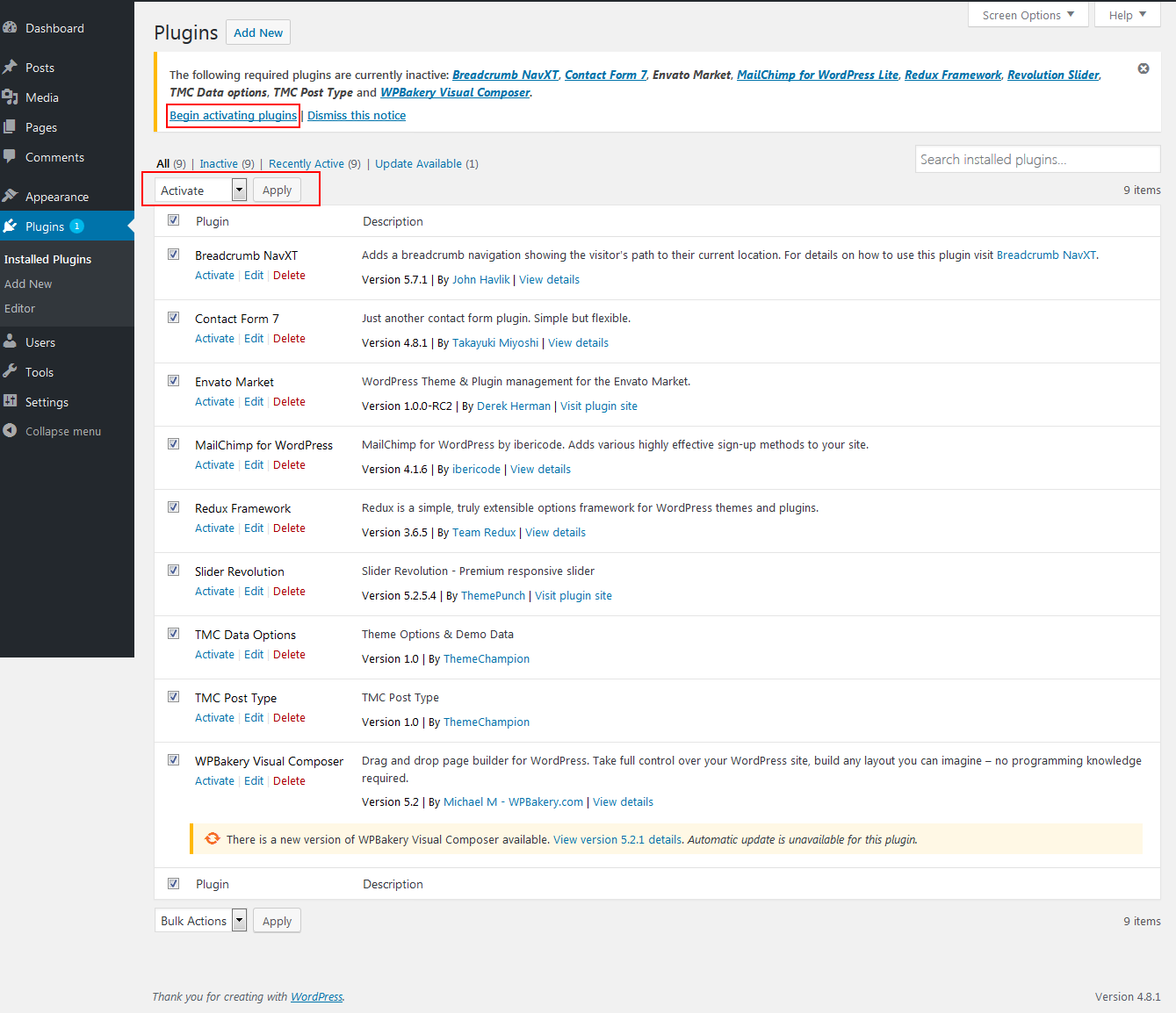 4. Select the plugins you had installed, and then apply the bulk action to activate them.