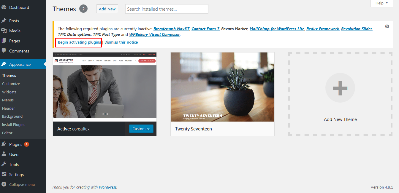 3. Once you have installed and activated our theme you will be prompted to install required and recommended plugins. Just click the link to Begin activating plugins.