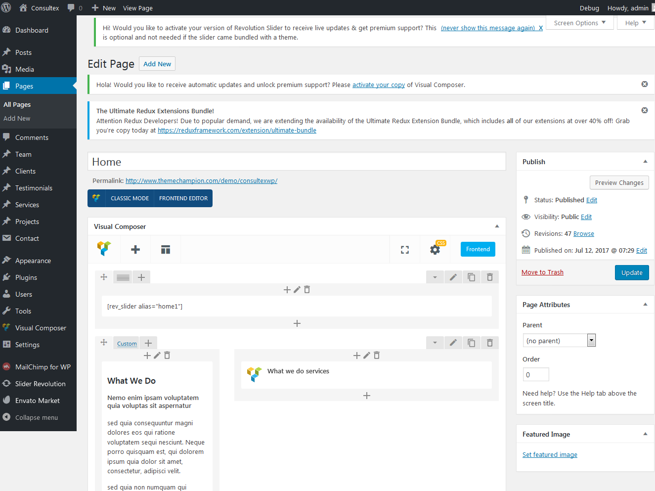 This theme includes support for the Visual Composer plugin. Visual Composer come with a lots of drag and drop modules to quickly and easily building your pages.