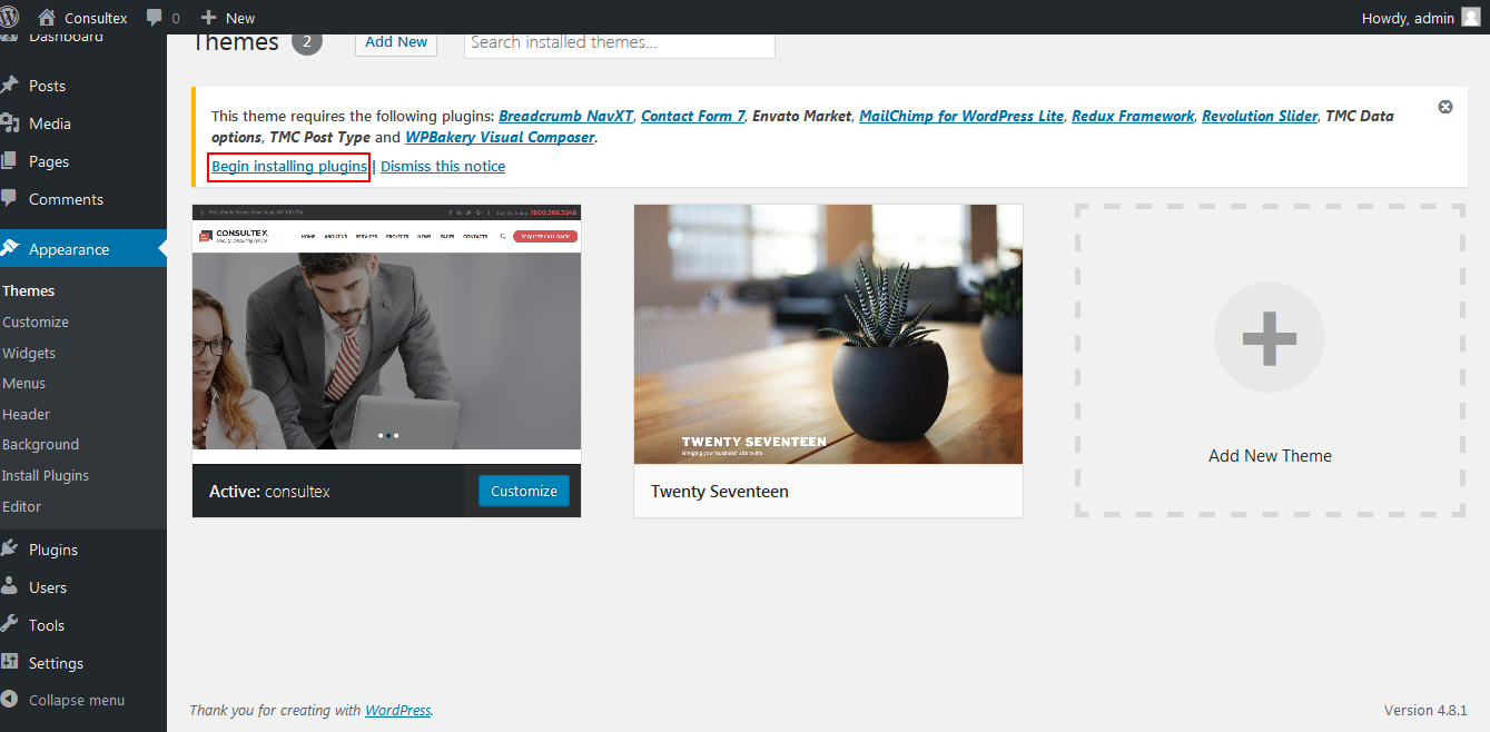 1. After theme install, Just click the link to Begin installing plugins.