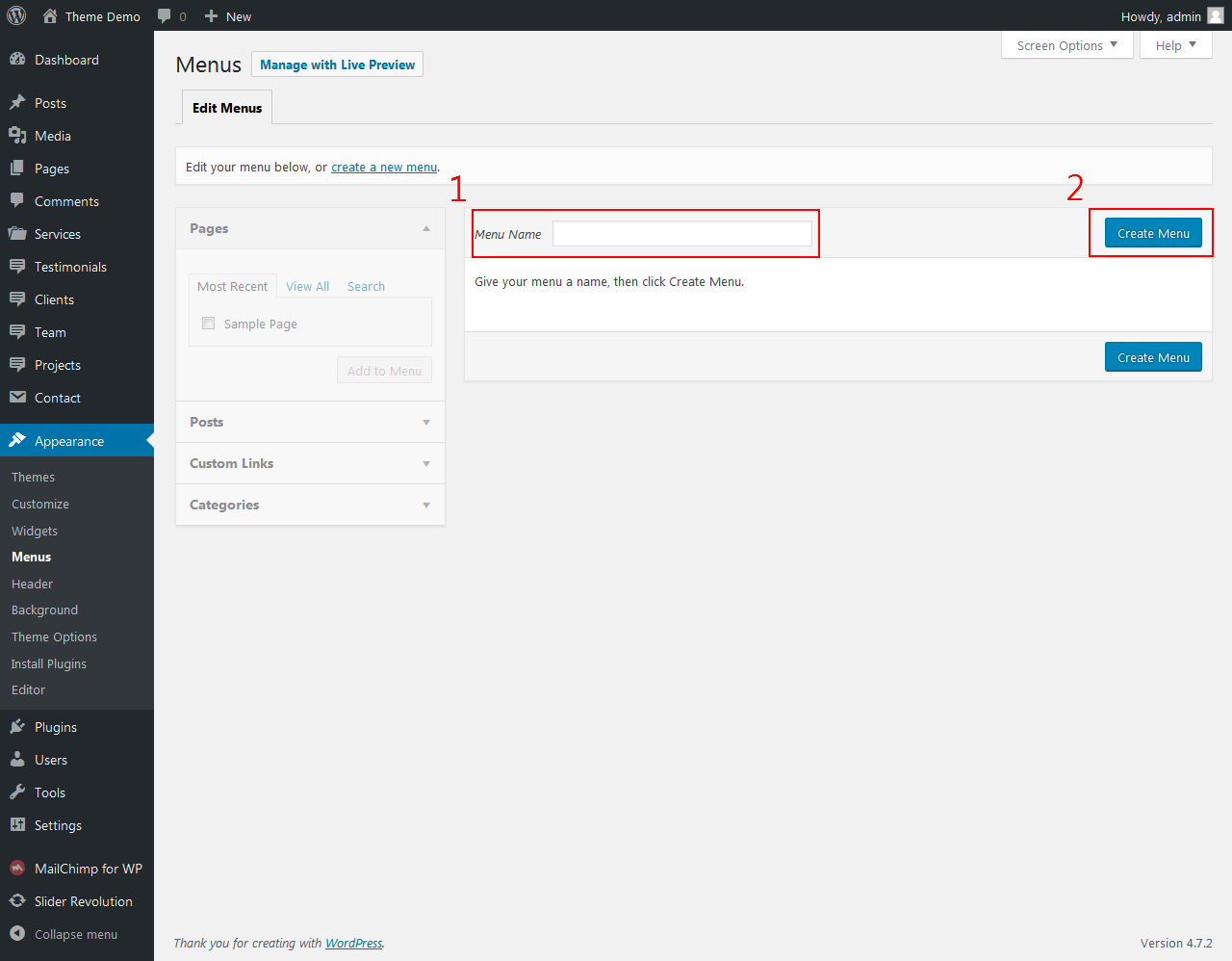 Step 1: Go to Appearance > Menu, enter your navigation name and click to Create Menu.