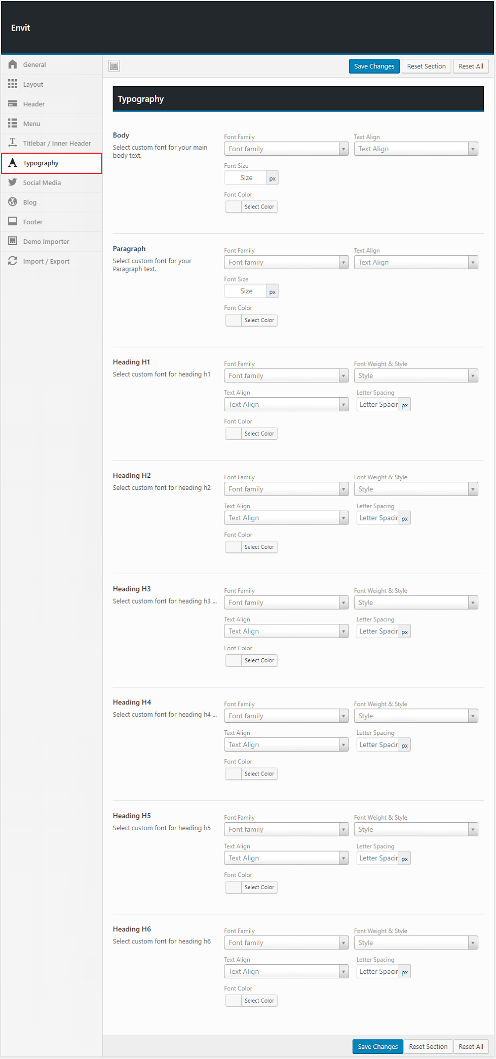 The theme option allow you to select from 500+ google fonts, You also can change font color, size, align etc..