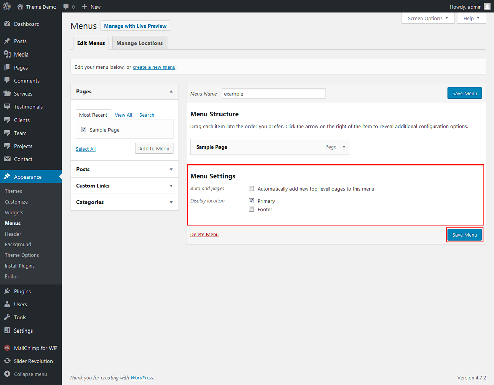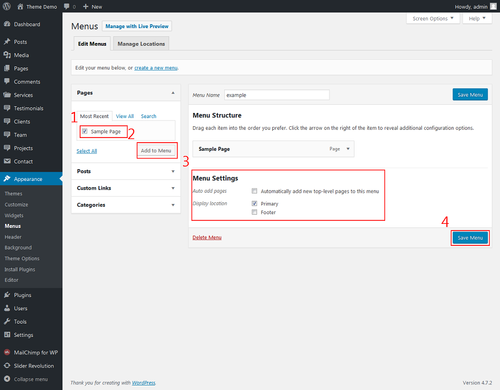 Step 2: Create new menu,Choose item from the left to menu area and Save.