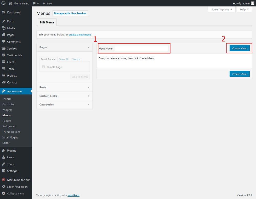 Step 1: Go to Appearance > Menu, enter your navigation name and click to Create Menu.