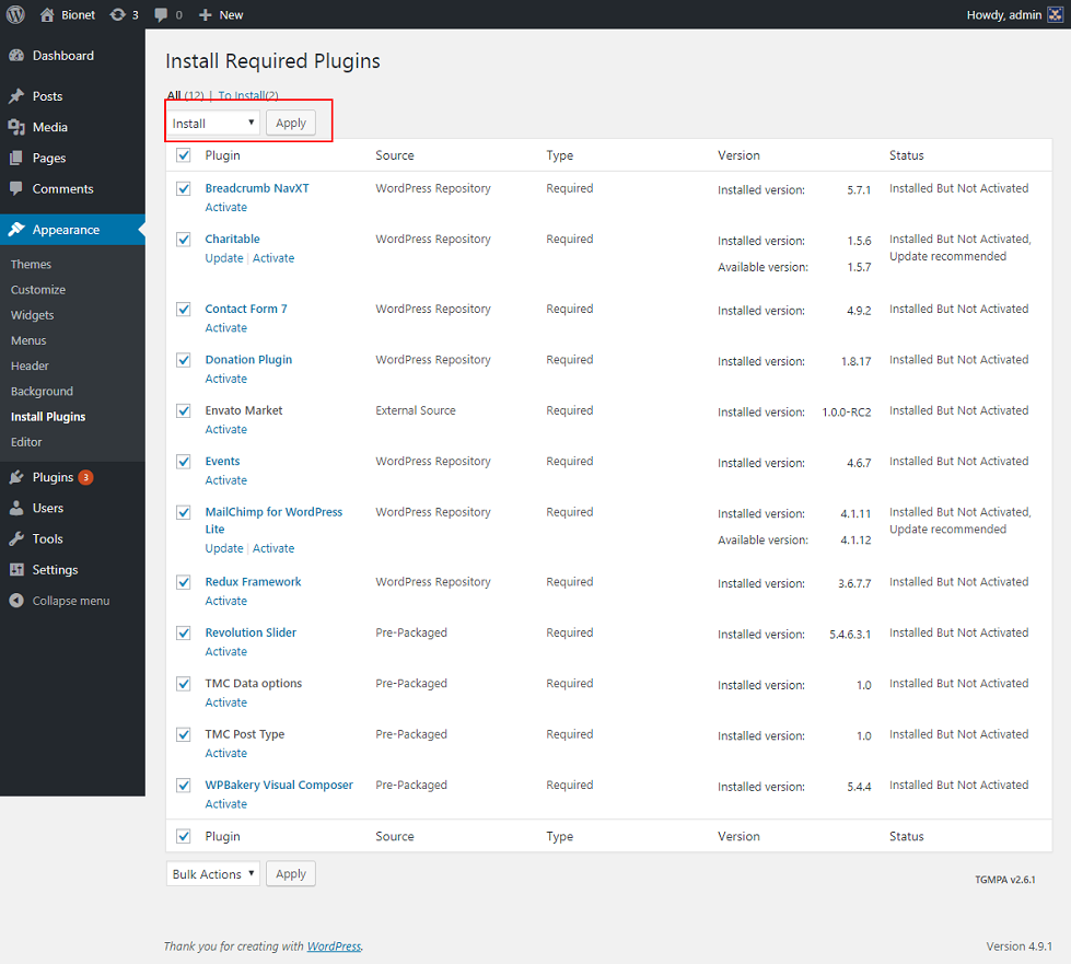 2. Next, check boxes to select all the plugins, select the bulk action of install from the dropdown box and then click the button to apply.