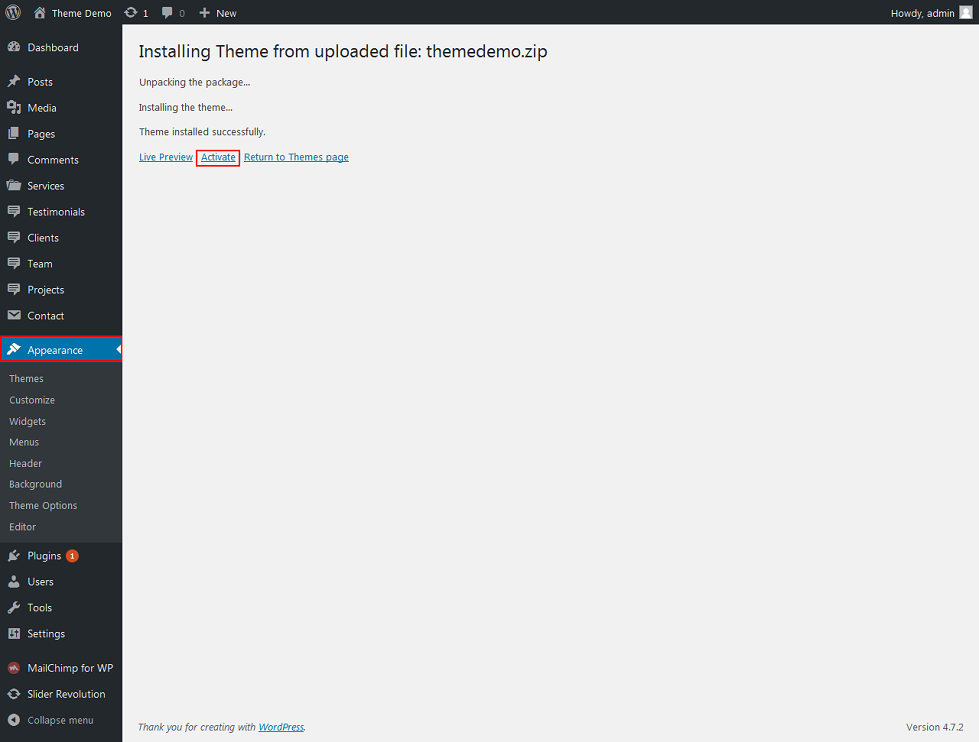 Step 3: After the installation progress completed, click Activate to activate your theme.